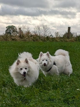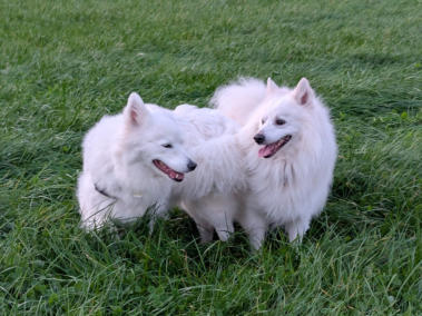 Die Uhr tickt … und so wollten wir es mit BOje ein letztes Mal wissen und ihren 2.Wurf in Angriff nehmen. Da unser C-Wurf mit ihr so wunderbare Welpen hervorgebracht hat, musste der Papa wieder BOjangles von den Eißeler Dorfspitzen sein, in den BOje und auch wir total verschossen waren und sind.Vom 26.10. bis 28.10.25 besuchten BOje und ich BOjangles und die Wiedersehensfreude war an allen drei Tagen groß. Es war wieder eine Verpaarung wie aus dem Bilderbuch. BOjangles und BOje umwarben sich gegenseitig, freilaufend in schönster Natur. So kam es „zum Äußersten“, ganz natürlich.Am 24.11.25 waren wir mit BOje zur Ultraschalluntersuchung. Diese bestätigte unsere Hoffnung, dass wir sie tragend ist und BOjangles Vater wird. Die kleinen Schimmelreiterspitze unseres D-Wurfes kamen am 24.12.25 zur Welt.