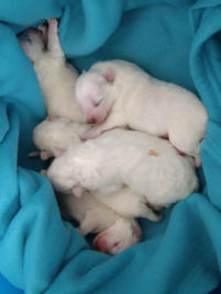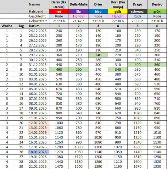 Tag 18 - Der erste Welpe (mit dem schwarzen Halsband) hat die 1000 g-Marke überschritten.